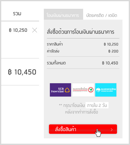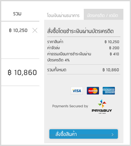 เมื่อเลือกซื้อสินค้าเสร็จแล้ว ให้กดปุ่ม สั่งซื้อสินค้า เพื่อไปหน้ากรอกข้อมูลเตรียมการชำระเงิน สินค้าทั้งหมดใน list ของตะกร้าสินค้าจะเข้ามาในระบบ โดยระบบจะส่งไปยังหน้ากรอกที่อยู่จัดส่ง ระบบจะแสดงค่าสินค้า และ ค่าส่ง พร้อมค่าธรรมเนียมการชำระเงิน ในกรณีเลือกชำระด้วยบัตรเครดิต / เดบิต