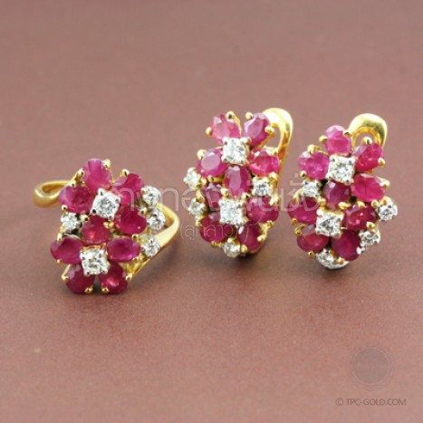 ชุดแหวนและต่างหู ทับทิมข้างเพชรทรงดอกไม้
